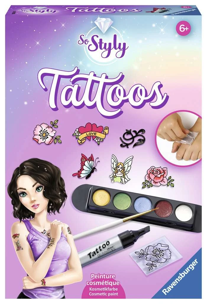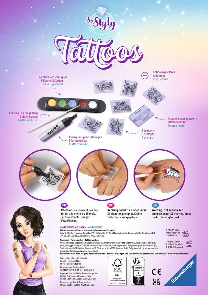Wie alles genau funktioniert, steht in der beigelegten Anleitung, die es Kindern ab 6 Jahren ermöglicht, individuelle Tattoos zu gestalten. Zusammen mit Freunden kann man sich gegenseitig mit tollen Motiven oder Farbvarianten der Vorlagen überraschen und selbst zum Tattookünstler werden. Einfach mit dem schwarzen Tattoomarker einen Stempel ausmalen und auf die Haut drücken. Die entstandenen Konturen können anschließend mit den beiliegenden Kosemtikfarben ganz individuell ausgemalt werden.