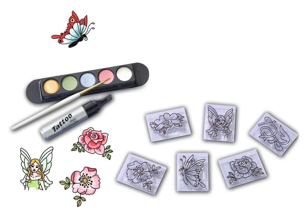 Die im Set enthaltenen Stempel bilden auf der Haut sozusagen die Malvorlage, die mit 5 Kosmetikfarben ausgemalt werden kann (weiß, rot, blau, grün und gelb). Wem die Stempel nicht ausreichen, der kann auch selbst mit den hautverträglichen Farben drauf losmalen und eigene Motive gestalten. Die Tattoos lassen sich jederzeit mit Wasser und Seife ganz einfach wieder entfernen!