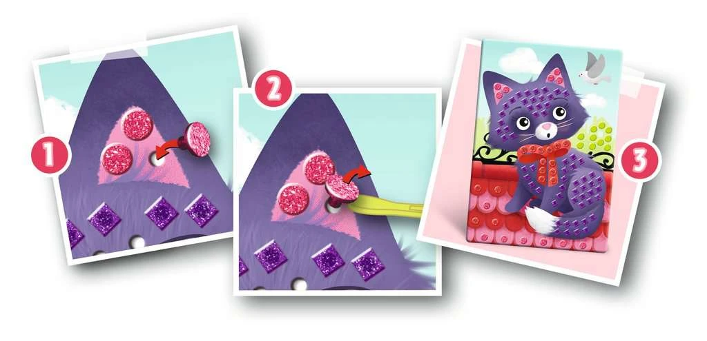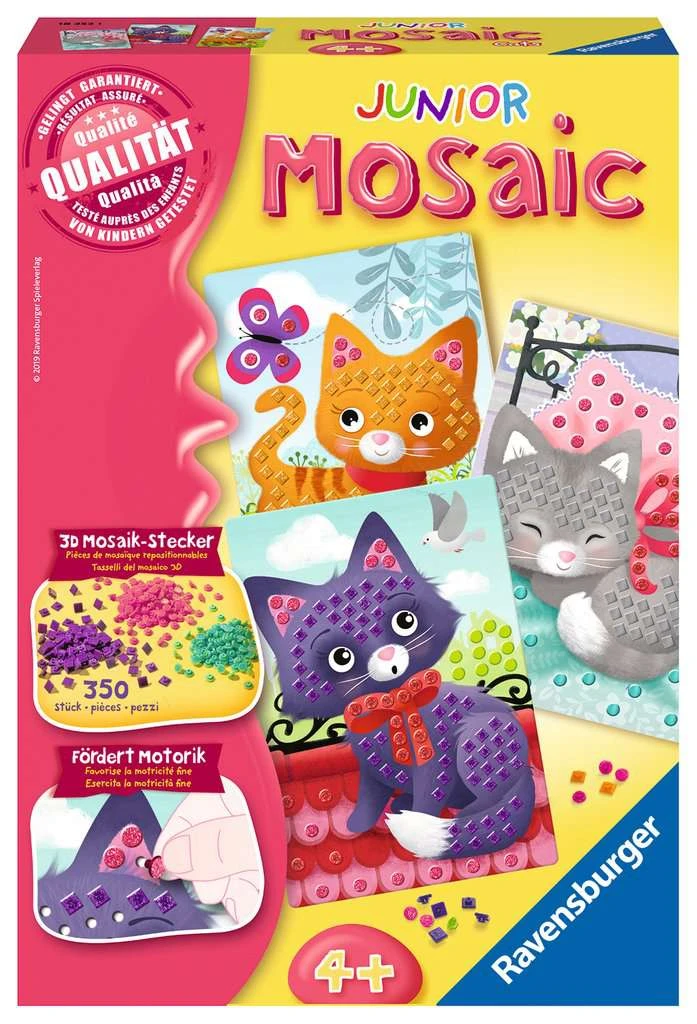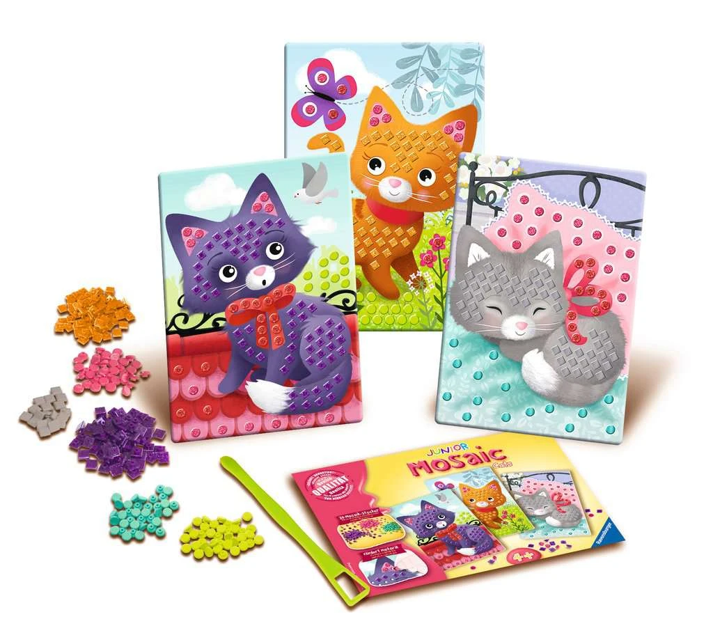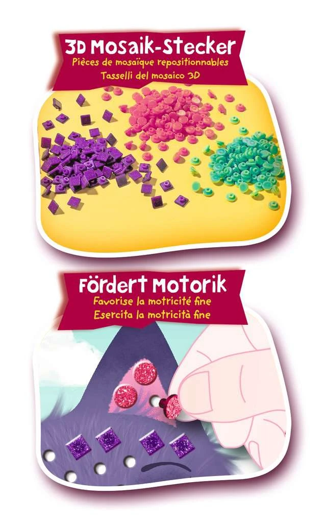 Farbenfrohe Mosaikbilder für die Kleinsten. Die Mosaiktechnik ist eine traditionelle Kunstform, die große Fingerfertigkeit, ein geübtes Auge und Kreativität erfordert. Erste neugierige Schritte in diese faszinierende Welt der Bildgestaltung können kleine Künstler jetzt schon im Kindergartenalter machen. Mit Junior Mosaic entstehen beliebte Motive aus bunten Steckteilen. Jede Stecktafel verfügt über ein Lochmuster, in das die Kinder bunte Mosaiksteine stecken können. Das farbenfrohe Kunstwerk ist fertig, wenn die Stanzlöcher alle mit den Pins ausgefüllt sind. Die große Zahl an Mosaiksteinen ermöglicht unzählige Steckvariationen und Farbenspiele. Dank des praktischen Werkzeugs lassen sich die Pins wieder mühelos lösen, und das kreative Gestalten kann jederzeit von vorne beginnen.