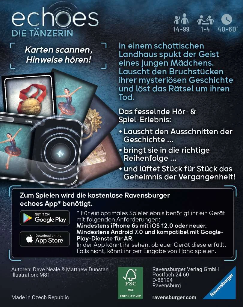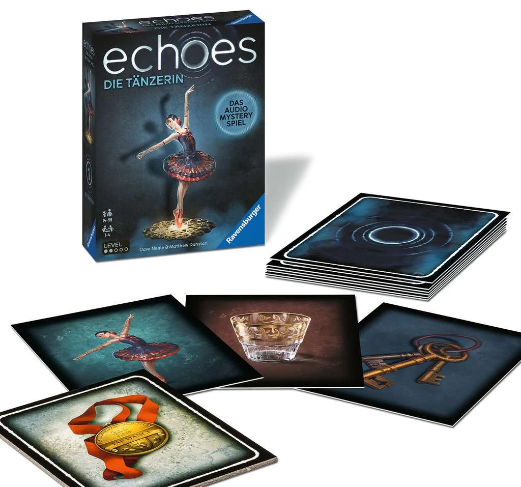 echoes ist ein einzigartiges, kooperatives Audio Mystery Spiel. Die Spieler hören mithilfe der kostenlosen Ravensburger echoes App mysteriöse Geräusche und Stimmen, die mit den Kartenmotiven verbunden sind. Gemeinsam bringen sie die 24 Teile der Geschichte in die richtige Reihenfolge, um den Fall zu lösen.
