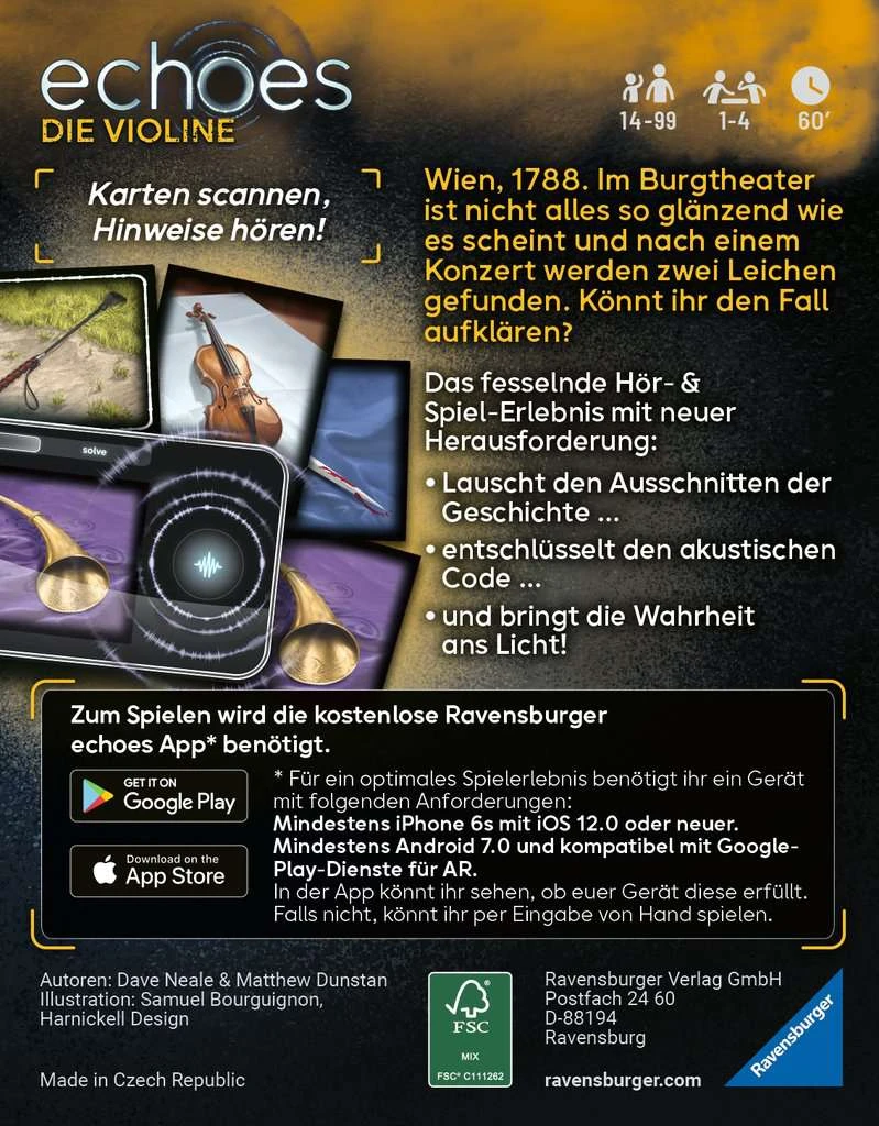 echoes ist ein einzigartiges, kooperatives Audio Mystery Spiel. Die Spieler hören mithilfe der kostenlosen Ravensburger echoes App mysteriöse Geräusche und Stimmen, die mit den Kartenmotiven verbunden sind. Gemeinsam bringen sie die 24 Teile der Geschichte in die richtige Reihenfolge, um den Fall zu lösen.