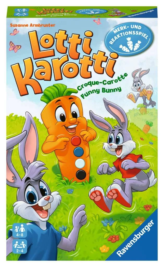 Bei der Spielvariante Lotti Memo merkt sich jeder Spieler, an welchem Platz die Hasen mit ihren unterschiedlich farbigen Füßen stehen. Der Spieler der an der Reihe ist, muss den farbigen Hasen finden, den die Karotte anzeigt und darf solange weitermachen, bis er einen falschen Hasen aufdeckt. Bei der zweiten Spielvariante Lotti Flotti werden nacheinander vier Hasen aufgedeckt, so dass ihre Füße sichtbar sind. Alle Spieler schauen gleichzeitig auf die Karottenkarten und müssen schnell reagieren. Wer als erster die Karte findet, die genau die Farb-Reihenfolge der vier Häschen abbildet, gewinnt die Karte. Die Mitbringspiele von Ravensburger sind speziell auf die verschiedenen Altersgruppen abgestimmt und überzeugen durch eine hochwertige Qualität. Das kompakte Format eignet sich besonders gut zum Mitnehmen für unterwegs oder auf Reisen.