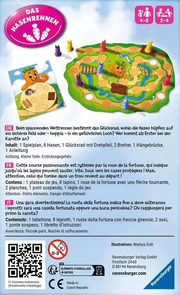 Mal zieht der Spieler mit einem seiner Hasen die gedrehte Anzahl an Feldern voran. Zeigt der Pfeil auf einen Maulwurf, darf man den Hasen eines Mitspielers ein Feld zurücksetzen. Manchmal fällt dabei dessen Hase in ein Loch und beginnt wieder von vorn – so ein Pech! Mit einem Brett kann ein offenes Loch wieder begehbar gemacht werden – oder man sogar den Weg abkürzen, indem man eine Brücke repariert. So bleibt es spannend bis zum Schluss, bis der erste Hase direkt auf dem Zielfeld bei der Karotte angekommen ist.