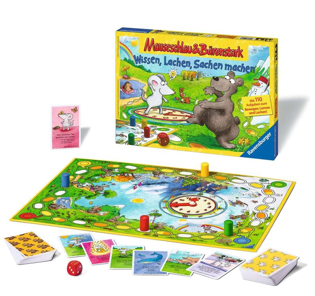 Mit ihrer Spielfigur starten die Kinder in den spannenden Wettlauf und ziehen entsprechend ihres Würfelergebnisses von Feld zu Feld. Wer auf einem Mauseschlau-Feld landet, darf eine Fragekarte beantworten, wer auf ein Bärenstark-Feld zieht, versucht sich an einer Aktionskarte. Gelingt die Aktion und ist die Frage richtig beantwortet, erhalten die Spieler die Karte als Belohnung! Wer hat am Ende die meisten Karten gesammelt? Mit dem Quiz- und Aktionsspiel „Wissen, Lachen, Sachen machen“ können Kinder ihr Wissen beweisen, viel Neues lernen, sich bewegen und dabei kräftig lachen! Ein lustiges Quiz- und Aktionsspiel, bei dem die ganze Familie Spaß hat!