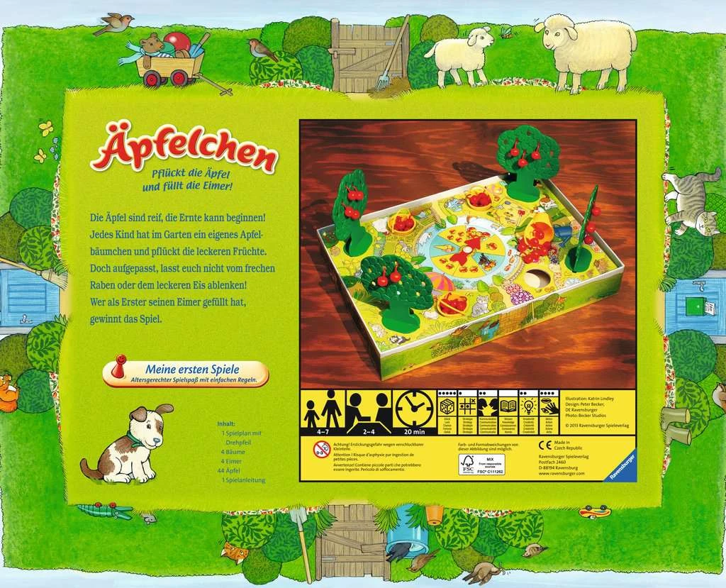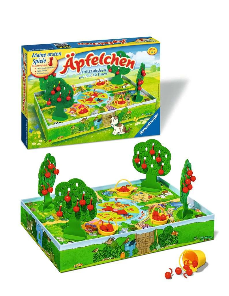 Der Drehpfeil im Spiel Äpfelchen gibt an, was die jungen Spieler als nächstes tun dürfen: Mal pflücken sie die entsprechende Zahl an Äpfeln von ihrem Baum. Ein anderes Mal lesen sie so viele Äpfel von ihrer Wiese auf, wie auf dem Feld abgebildet sind, auf das der Pfeil zeigt.