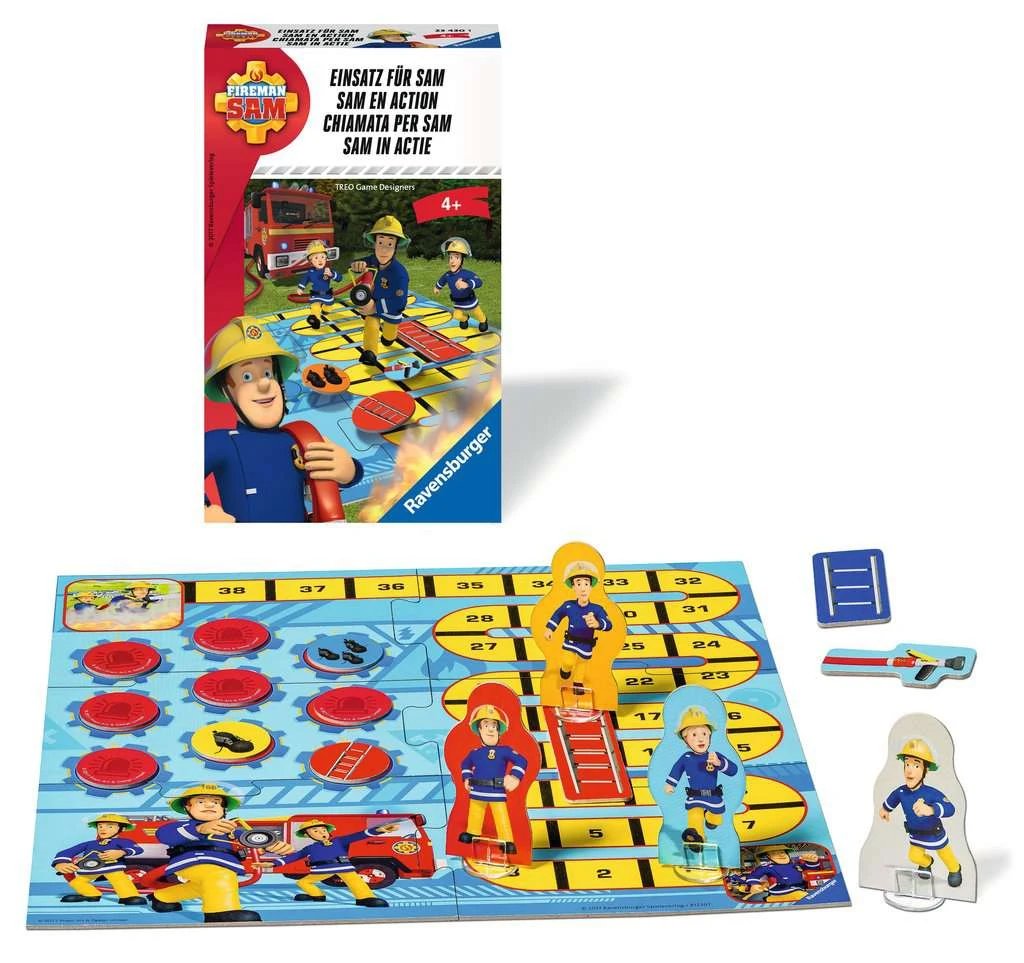 Feuerwehrmann Sam und seine drei Kollegen aus dem Hafenstädtchen Pontypandy werden zu einem neuen Brandeinsatz gerufen. Nicht nur auf den TV- und Computer-Bildschirmen, sondern auch auf dem Spielplan wollen die Feuerwehrleute schnellstmöglich zum Einsatzort gelangen, um das Feuer zu löschen. Damit das gelingt, brauchen die Spieler ein gutes Gedächtnis und auch eine Portion Glück. Ein Riesenspaß für alle Kids, die davon träumen, später einmal Feuerwehrmann oder -frau zu werden.