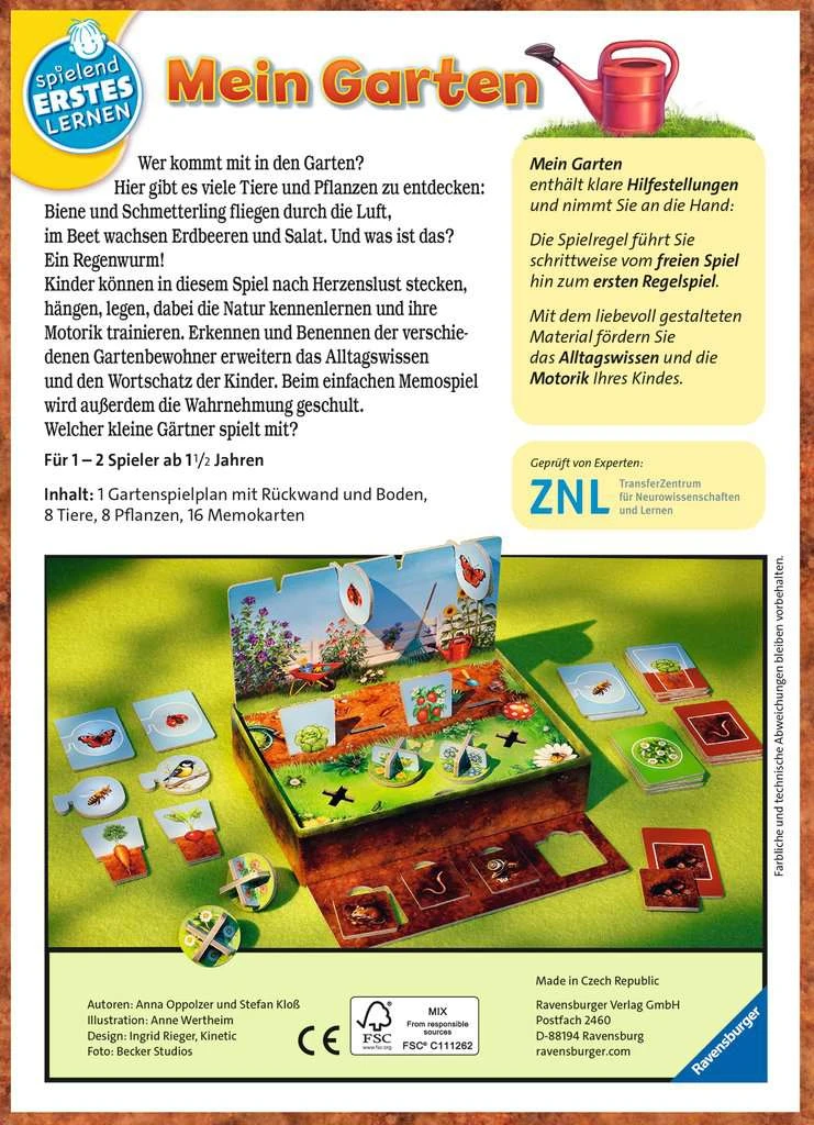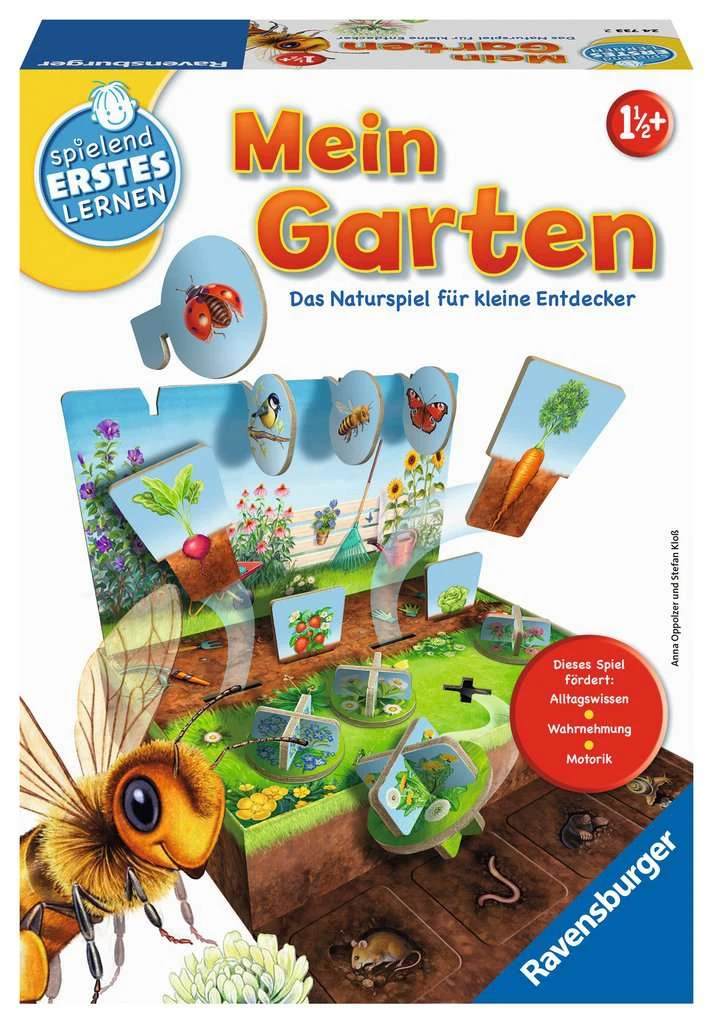 Bei dem Spiel für kleine Entdecker „Mein Garten“ lernen Kinder verschiedene Blumen kennen: Gänseblümchen, Löwenzahn, Vergissmeinnicht und Klee werden als kleine Sträußchen in die Vertiefungen im Spielplan gesteckt. Genau die richtige Aktivität für kleine Kinderhände. Auch Erdbeeren, Salat und Radieschen sowie Tiere wie Biene, Schmetterling und Marienkäfer werden von den Kindern im Garten platziert. Das fördert ihre Motorik und ihr Alltagswissen und erweitert den Wortschatz. Durch zwei Spielvarianten wächst das Spiel mit den Kindern mit. Beim Memospiel üben Kinder auch das Formen erkennen. „Mein Garten“ aus der Reihe Spielend Erstes Lernen von Ravensburger enthält Materialien, die mit großer Sorgfalt ausgewählt und getestet sind, und bietet eine sinnvolle Unterstützung bei der Förderung Ihres Kindes.