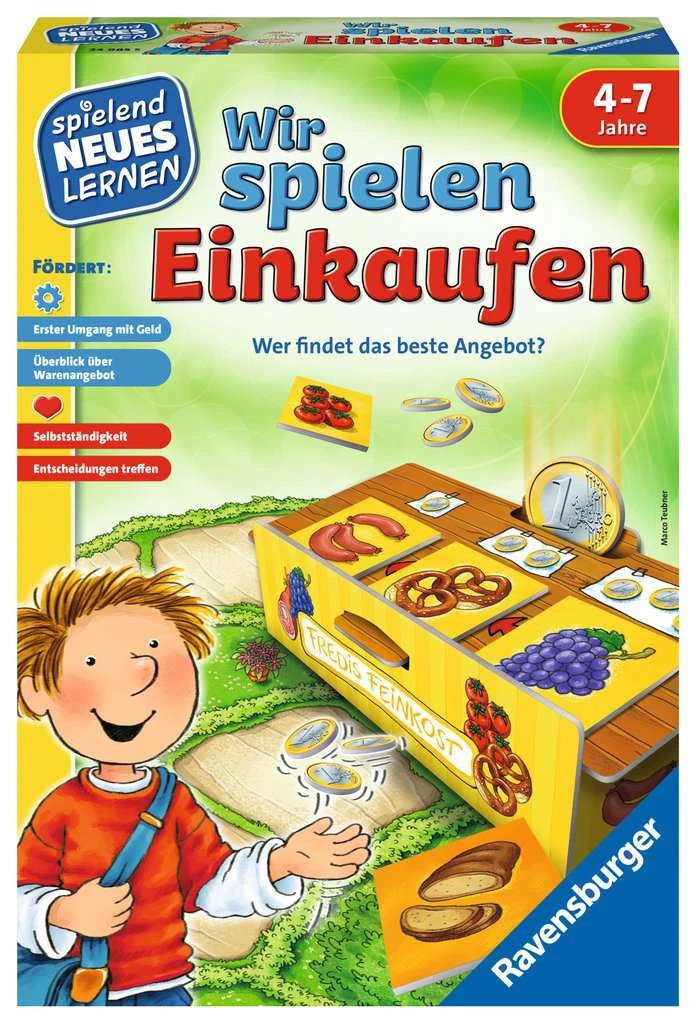 Sobald die Einkaufslisten verteilt sind geht es los: Würfeln und am passenden Stand die günstigsten Waren für die Liste kaufen und das Geld in den Schlitz werfen. Aufmerksam beobachten und berücksichtigen die Kinder die Preisveränderungen im Spielverlauf. Einkaufsprofis schätzen bereits vor dem Einkauf, wie viel die Waren auf der Einkaufsliste kosten werden, und spielen dann erst los. Bei „Wir spielen Einkaufen“ wird das mathematische Grundverständnis der Kinder ausgebaut. Sie entwickeln dadurch immer größere Sicherheit und trauen sich auch bald, zusammen mit ihren Eltern im realen Leben auf dem Wochenmarkt einzukaufen. Lernspiele, die richtig Spaß machen: So heißt das Motto der Lernspielreihe von Ravensburger, mit der Kinder in den lernintensivsten Jahren in ihrer Entwicklung unterstützt werden. Alle Spiele werden nach neuesten wissenschaftlichen und pädagogischen Standards entwickelt und geprüft. Die Lernstoffe sind in spannenden Geschichten verpackt, eine Vielfalt an Materialien und Methoden erlaubt das Lernen mit allen Sinnen.