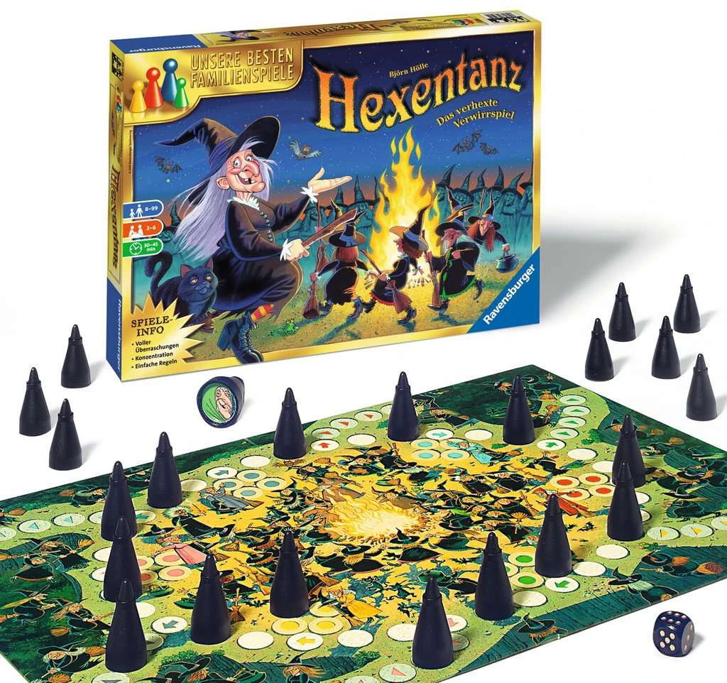 Übrigens: Landet eine Hexe auf einem Feld, auf dem schon eine andere Hexe tanzt, muss sie mindestens sieben Felder oder bis auf ein freies Feld dahinter zurück tanzen. Dann werden alle Mitspieler kurz informiert, was für eine Hexe das ist, und weiter geht’s. Taktik, Glück und ein gutes Gedächtnis verhelfen den pfiffigsten Spielern, ihre Hexen als Erste zum richtigen Abflugort zu bringen – also die Kräuterhexen auf die grünen Felder, die Feuerhexen auf die roten. Am Ziel angekommen, werden sie enttarnt und falls eine im Verwirrspiel Hexentanz am falschen Ort gelandet ist, fliegt sie zum richten Abflugort.