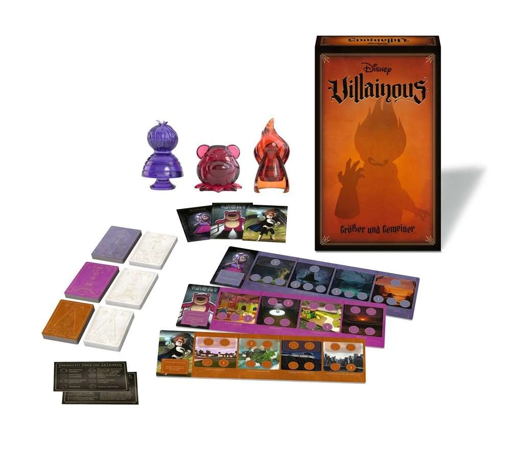Bei diesem Brettspiel entdecken die Spieler einzigartige, mächtige Fähigkeiten um ihrem Ziel näher zu kommen: Syndrome muss einen verbesserten Omnidroid und alle Helden in seinem Reich besiegen und Lotso muss vier Helden mit einer Stärke von 0 zusammen mit Buzz Lightyear im Raupenraum in die Falle locken, während Madam Mim alle von Merlins Verwandlungen besiegen muss. Um die Mitspieler in die Schranken zu weisen, können die Spieler ihren Gegnern das Schicksal auf den Hals hetzen. Wer wird in diesem Wettstreit der dunklen Mächte nun triumphieren? Für noch mehr Herausforderung oder eine Partie mit mehr Spielern, können die Schurken aus anderen Disney Villainous Spielen mit Größer und Gemeiner kombiniert werden.