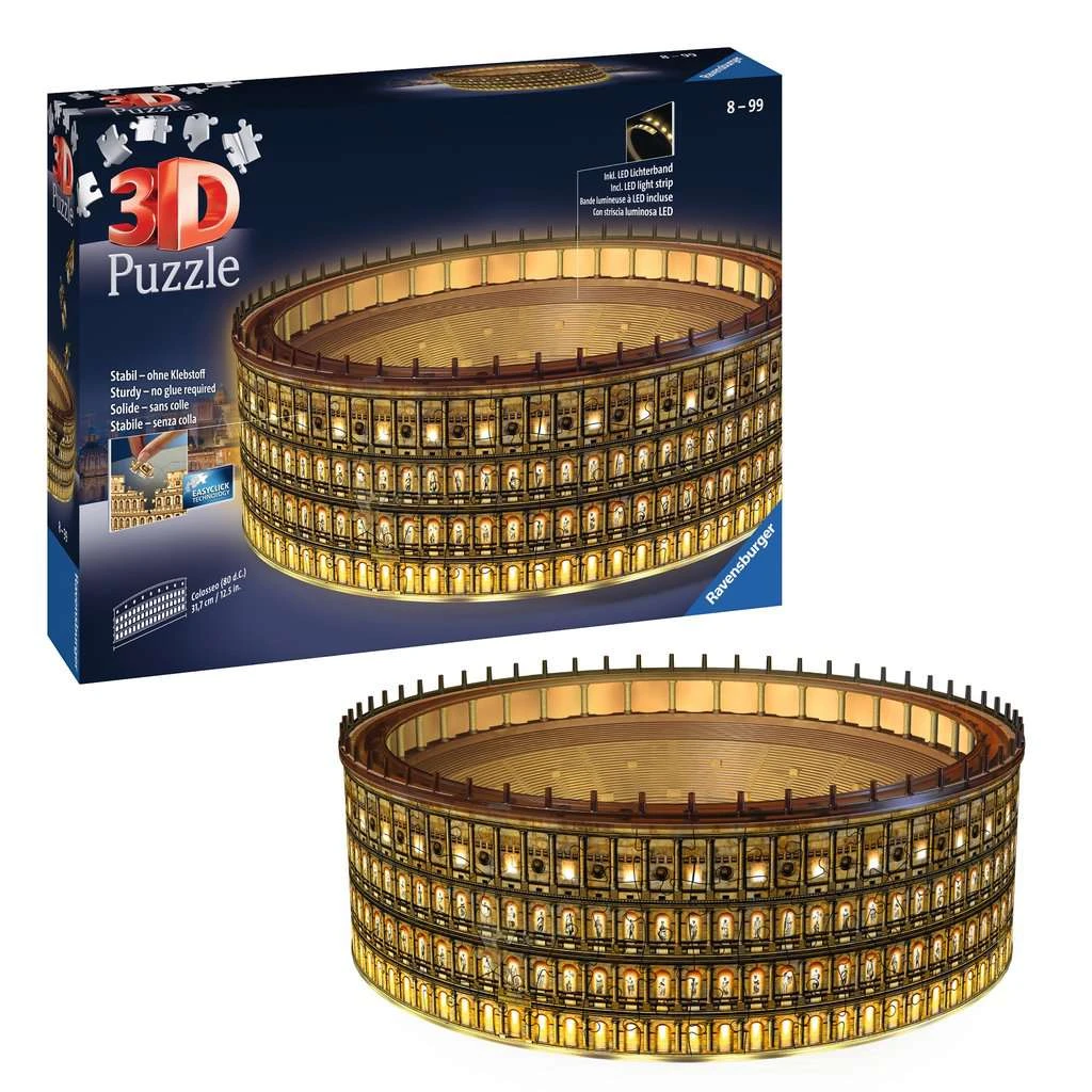 Gladiatoren aufgepasst! Jetzt gibt es die berühmteste Arena des antiken Roms als beleuchtetes 3D Puzzle Gebäude von Ravensburger. Die nummerierten Kunststoff-Puzzleteile passen dank EasyClick Technology perfekt ineinander und ermöglichen stabiles Puzzeln, ganz ohne Kleben. Die Nummerierung auf der Rückseite der Teile erleichtert das Vorsortieren und ermöglicht das Puzzeln nach Zahlen.