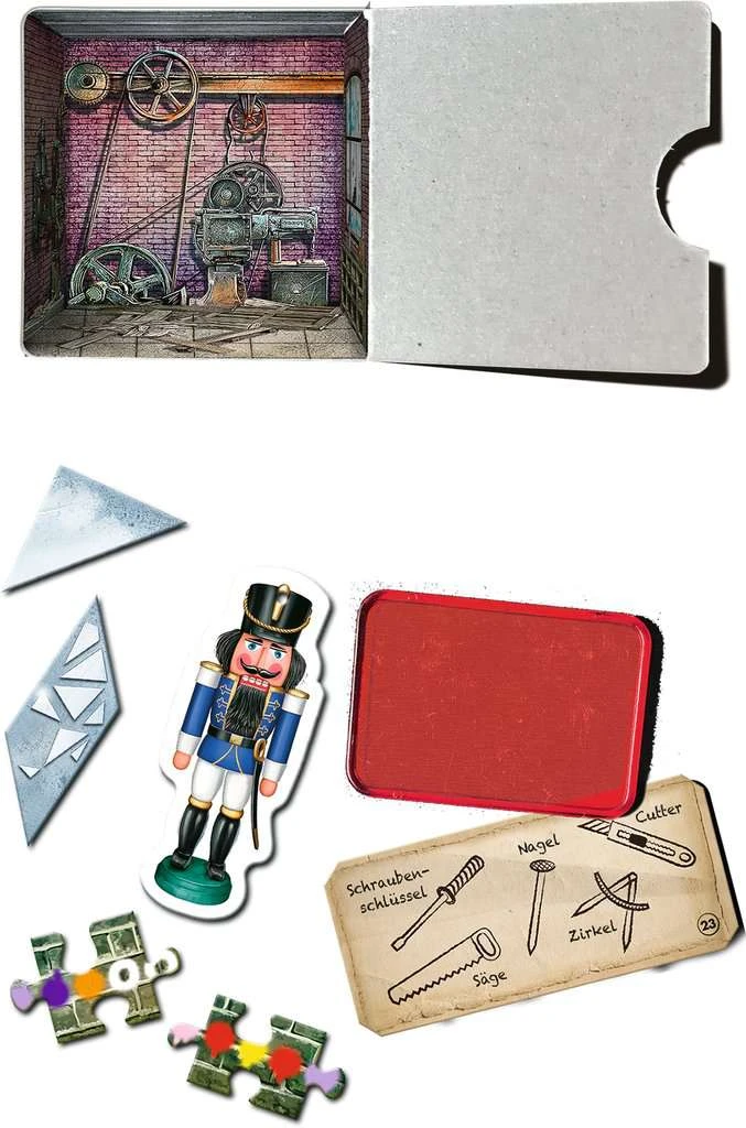 Um die richtige Tür für den folgenden Tag zu finden, muss das Rätsel im Raum gelöst werden. Dazu finden sich Hinweise in den detailreich illustrierten Fächern, auf insgesamt 55 Rätselkarten und auf verschiedensten Knobelelementen. Wer schlau kombiniert, findet die Lösung und somit zum Symbol des folgenden Türchens.