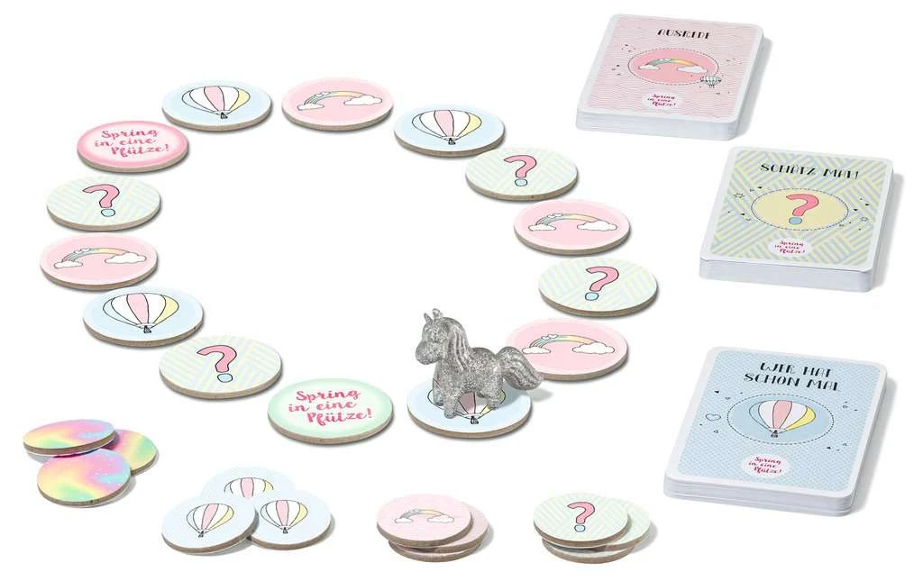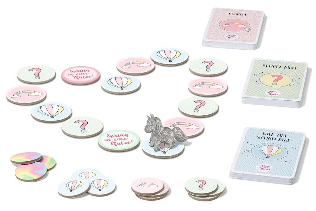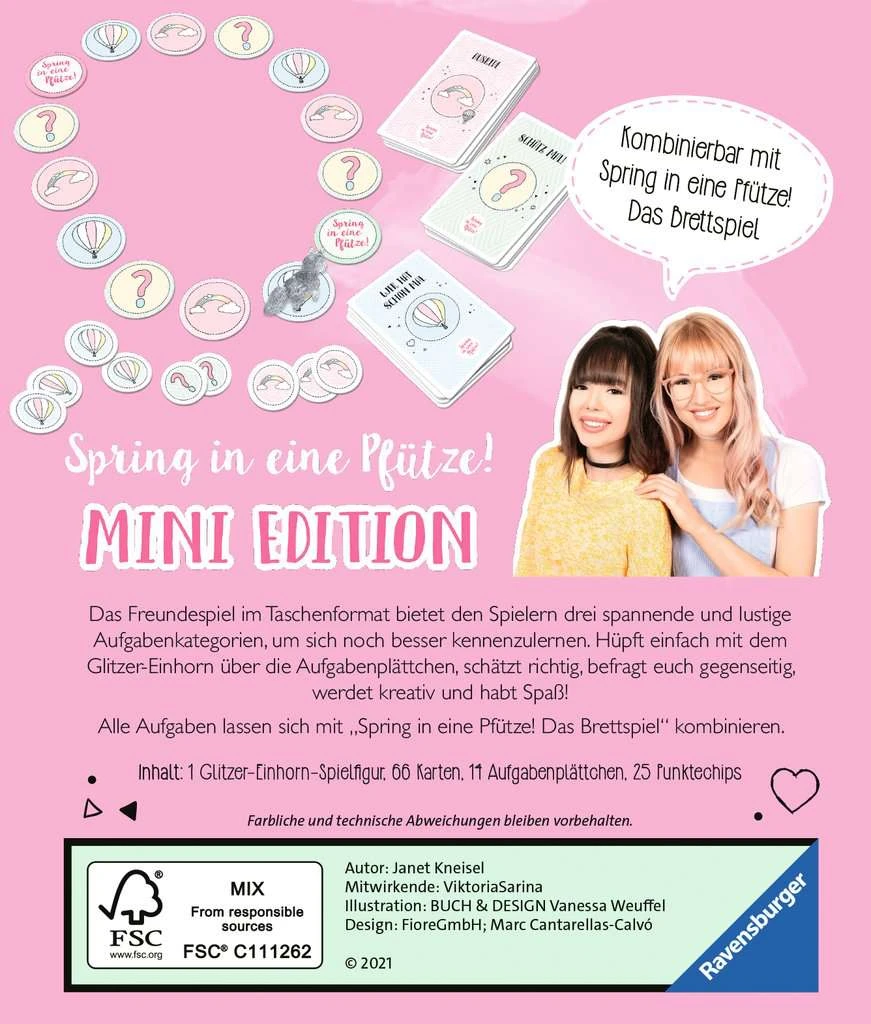 Die Social Media-Stars Viktoria und Sarina zählen zu den erfolgreichsten YouTuberinnen Österreichs. Die beiden Grazerinnen sind schon seit dem Kindergarten beste Freundinnen und kennen sich in- und auswendig. Auf ihren Social Media Kanälen beschäftigen sie sich mit verschiedensten Themen, wie unter anderem DIY, Trends und Challenges. Eine perfekte Kombination für Familienspiele! Die Spring in eine Pfütze! Mini Edition kombiniert Freundschaft und Kreativität in einem Spiel für beste Freunde oder für die, die es noch werden wollen. Das BFF-Kommunikationsspiel bietet euch drei neue, mitreißende und witzige Aufgabenkategorien: Mit Schätz mal!, Wer hat schon mal… und Welche Ausrede hast du?, habt ihr die Möglichkeit, noch mehr über eure Freunde zu erfahren. Zieht einfach mit dem niedlichen Glitzer-Einhorn über die Aufgabenplättchen, wählt eine Aufgabe und stellt euch der Herausforderung. Erzählt über eure Erlebnisse und vergesst dabei aber nicht, fleißig Punktchips zu sammeln! Denn nur, wer sich als richtig guter Freund erweist und die meisten Punktechips sammeln konnte, wird zum BFF-Champion der Partie gekürt! Das kleinformatige Spring in eine Pfütze! Spiel ist eigenständig oder für noch mehr Spielspaß in Kombination mit dem bereits erschienenen Brettspiel spielbar.