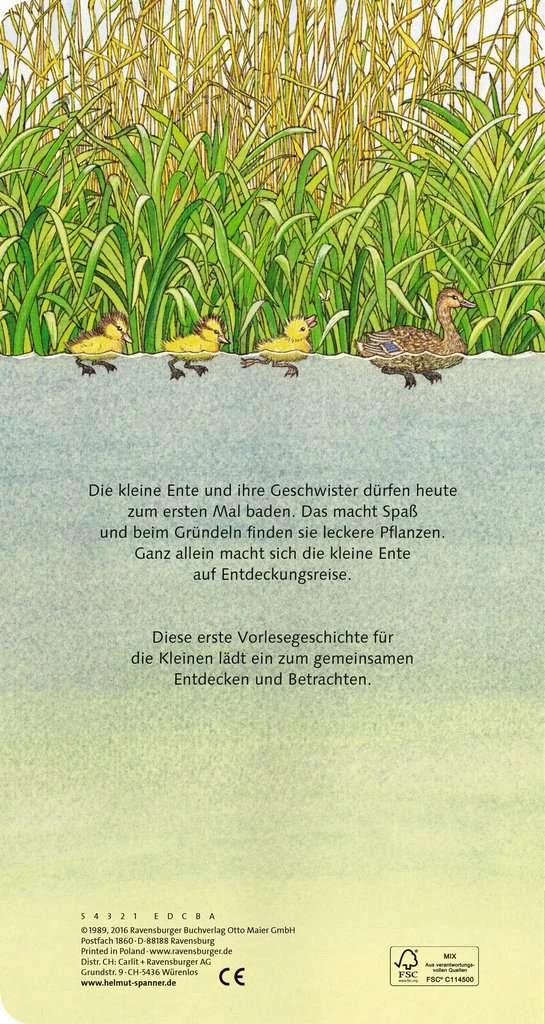 Die kleine Ente macht einen Ausflug an den See und erlebt viele kleine Abenteuer: Sie begegnet dabei vielen anderen Tieren wie der Möwe, dem Frosch, dem Schwan und dem Hund. Am Abend ist sie froh, wieder im warmen Nest zu sein. Eine kleinschrittig erzählte erste Vorlesegeschichte, optimal abgestimmt auf die Wahrnehmungsfähigkeiten und die emotionale Entwicklung der Kleinsten. Dieses Buch ist ein zeitloser Klassiker im Kinderzimmer und begeistert seit Jahrzehnten Kinder und Erwachsene.