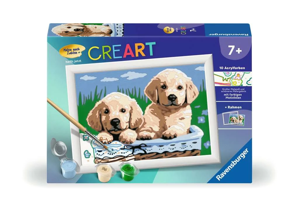Dank der farbigen Motivlinien, können die Kinder das ganze Motiv Süße Hundewelpen und die Farben schneller erkennen. Der Pinsel hat eine gute Führung und so entsteht nach und nach ein perfektes Bild.