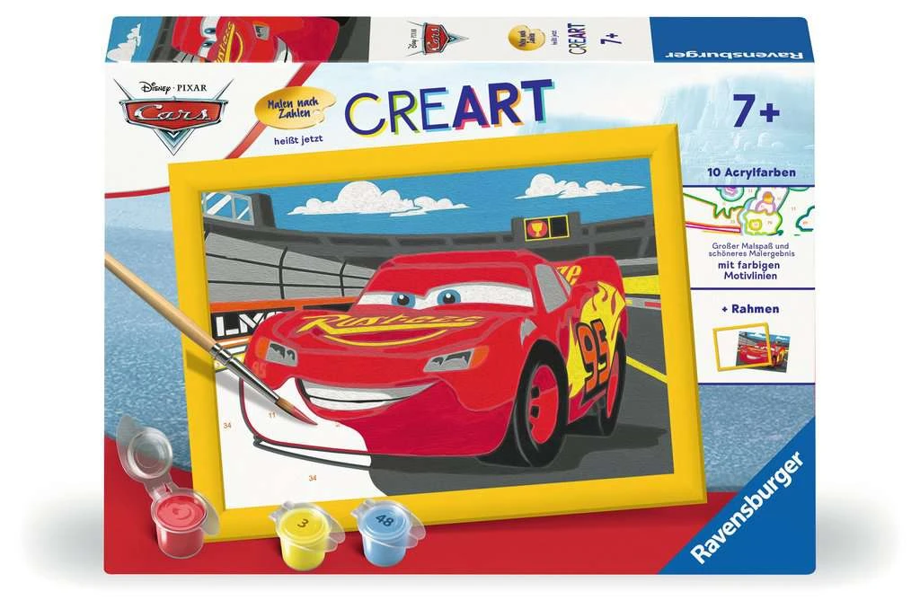 Dank der farbigen Motivlinien, können die Kinder das ganze Motiv Lightning McQueen und die Farben schneller erkennen. Der Pinsel hat eine gute Führung und so entsteht nach und nach ein perfektes Bild.