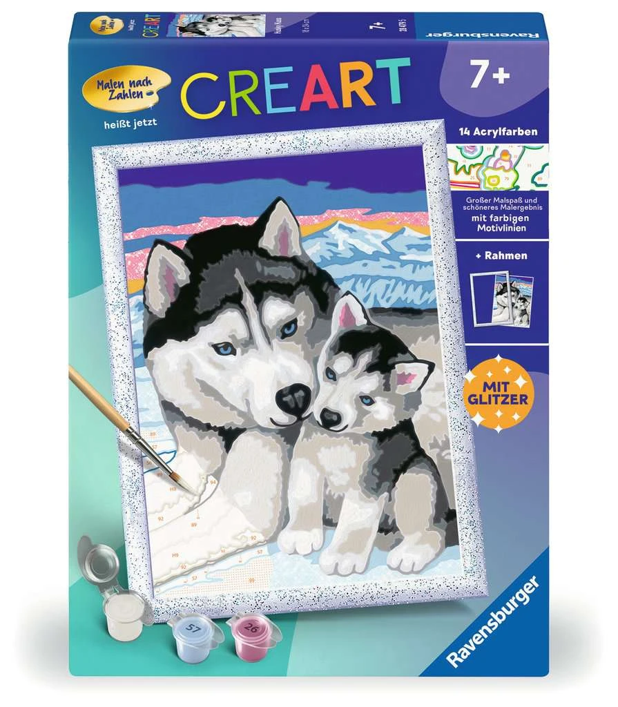 Dank der farbigen Motivlinien, können die Kinder das ganze Motiv Husky Kuss und die Farben schneller erkennen. Der Pinsel hat eine gute Führung und so entsteht nach und nach ein perfektes Bild.