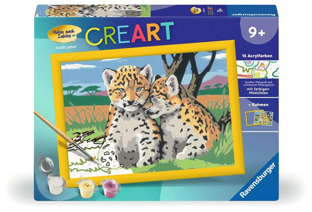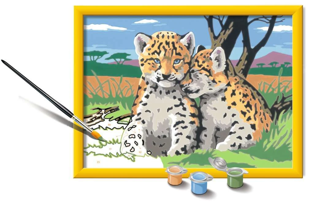 Dank der farbigen Motivlinien, können die Kinder das ganze Motiv Kleine Leoparden und die Farben schneller erkennen. Der Pinsel hat eine gute Führung und so entsteht nach und nach ein perfektes Bild.