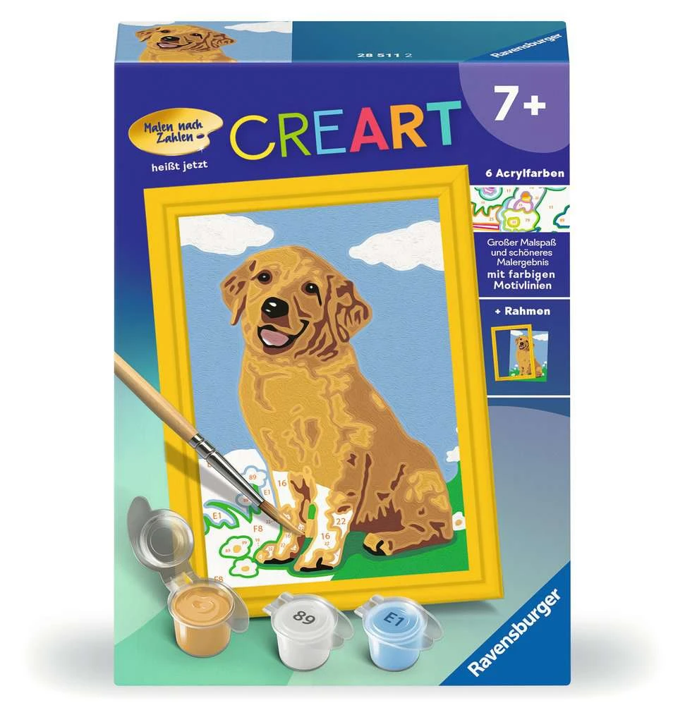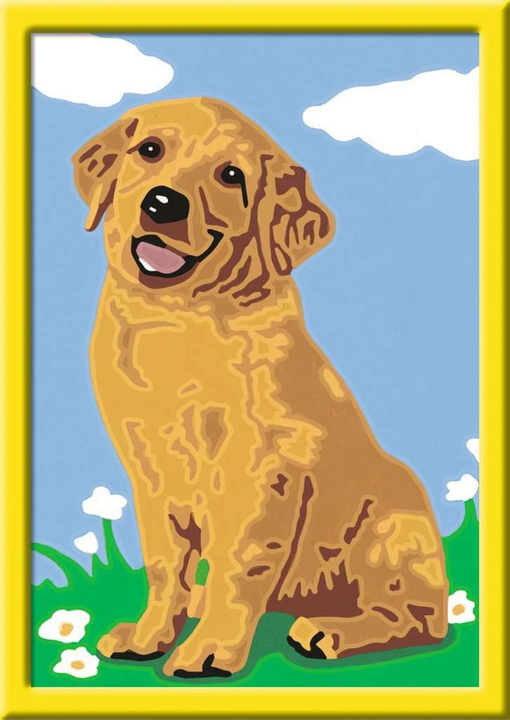 Dank der farbigen Motivlinien, können die Kinder das ganze Motiv Kleiner Golden Retriever und die Farben schneller erkennen. Der Pinsel hat eine gute Führung und so entsteht nach und nach ein perfektes Bild.